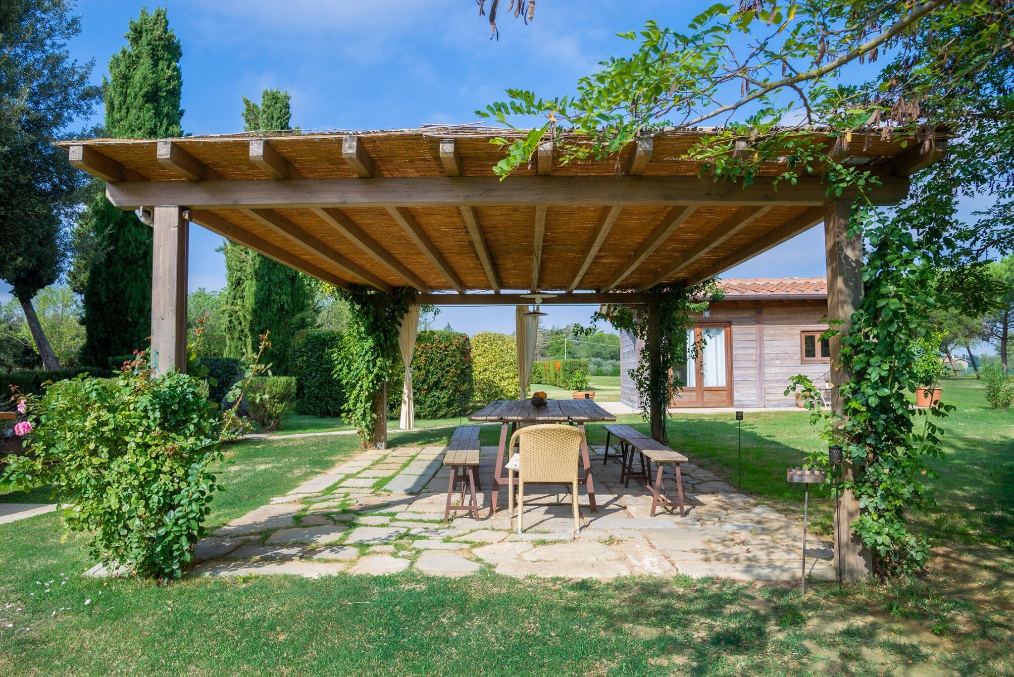 Situata sul sito di un antico monastero, in una zona elevata e isolata, la villa si apre su un ampio giardino circondato da cipressi e pini. Un cancello dal giardino conduce alla piscina, circondata da ulivi e con un incantevole panorama sulla Val di Chio.
